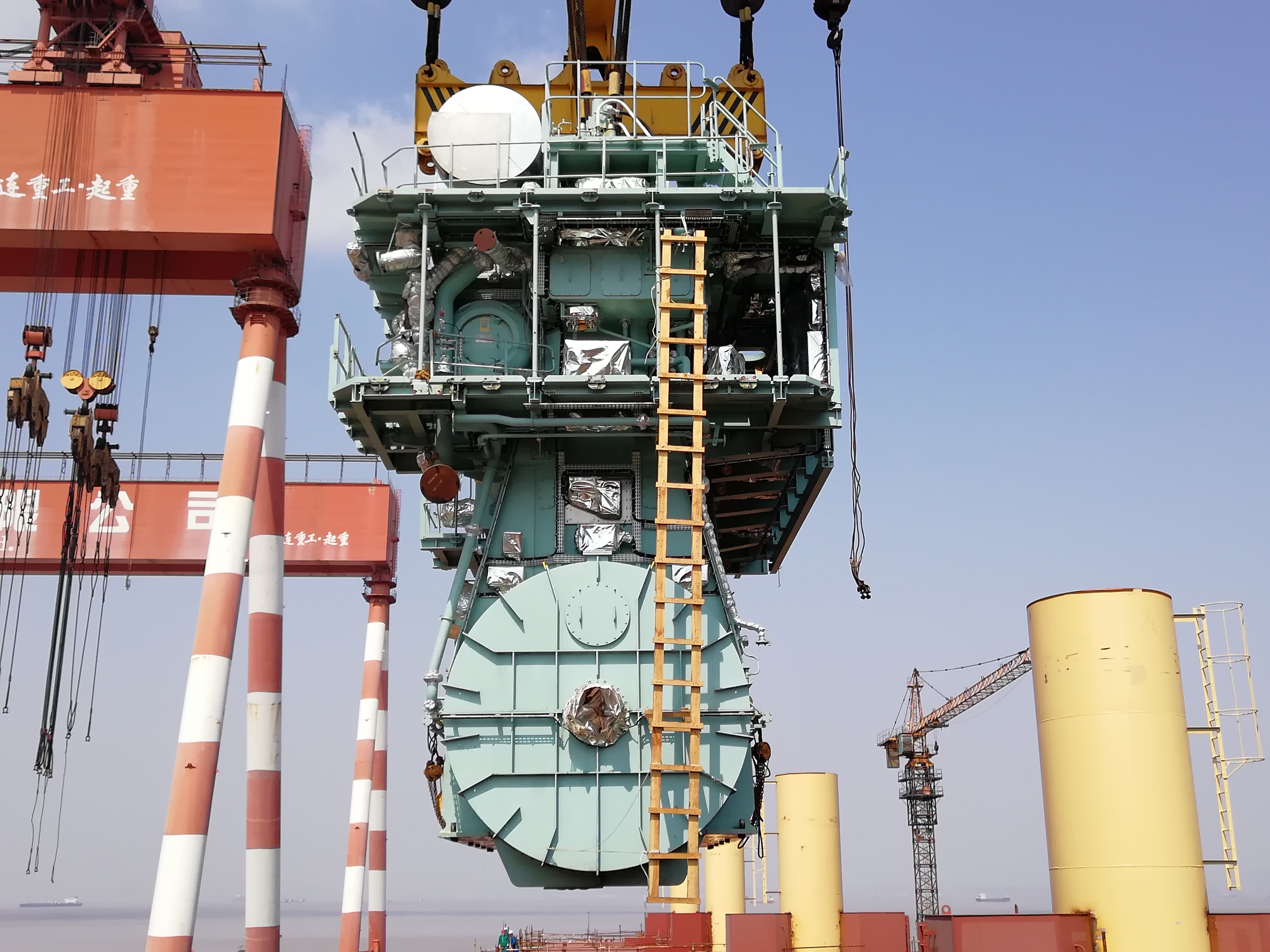 9點50分左右,吊機正式運行。在地面主指揮與操作工的不斷溝通之中,主機底部的水平高度已經吊至艏舷至高點以上,留有一定的高度空間。從圖紙分析,最高起吊高度是37.2米,船體艏樓舷墻最高點高度為20.3米,吊具的高度為7米(含鋼絲繩吊索6.2米,兩個卸扣0.8米),此方案安全可行。為了避開船甲板上部的各搭設腳手架等至高點,調整主機移至船艏右側向船艉機艙室移動的方案。
