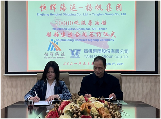 2021年3月5日,揚(yáng)帆集團(tuán)股份有限公司與浙江恒暉海運(yùn)有限公司成功簽約1艘20000噸級(jí)原油船建造合同。該合同是繼2019年12月30日揚(yáng)帆集團(tuán)與恒暉海運(yùn)簽署1艘18000噸成品油/化學(xué)品船建造合同后的第二次成功合作。